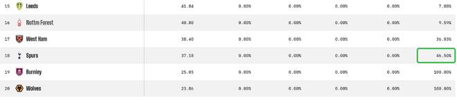 OPTA预测:热刺成英超降级大热门,降级概率已达46.5%