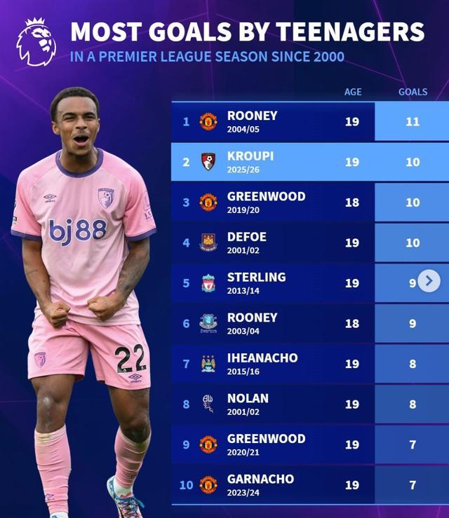 2. 克鲁皮(伯恩茅斯)2025-26赛季 19岁 10球