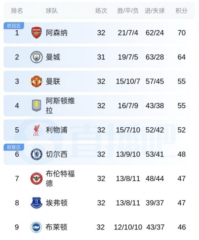 目前阿森纳、曼城两队争冠暂时没有分出高下,不过他们肯定会拿到一个门票的。排第三的曼联,及接下来的阿斯顿维拉分数一样,第五的利物浦比第三的曼联仅仅差了3分,再往后切尔西、布伦特福德、埃弗顿、布莱顿分数差只有2分,赛事还剩下6轮总计18分,这三个资格到底归属谁,很难讲。