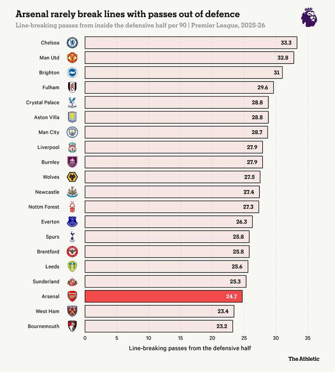 下面的柱状图显示,本赛季阿森纳在本方半场内完成的穿透防线的传球次数极少,只有西汉姆联和伯恩茅斯比他们更少。虽然这项数据有一些限制条件(对手可能不会像对其他球队那样以同样的强度压迫阿森纳,从而减少了他们传出穿透球的机会),但它确实表明,阿森纳在从后防线上送出犀利传球方面遇到了困难。那种通过三线之间一脚传球快速推进的日子,感觉已经是很久以前的事了