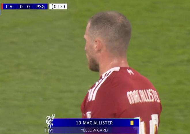 此役主场对阵巴黎圣日耳曼,麦卡利斯特在上半场补时阶段因犯规领到一张黄牌。
