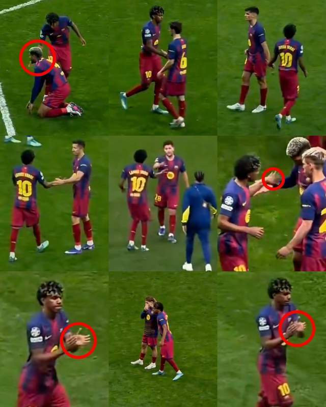 阿劳霍跪在地上,亚马尔与乌拉圭中卫击掌,并将他拉起来;加维、巴德吉、莱万看上去心情不佳,亚马尔上前,与他们一一击掌,送上鼓励;对于来到大都会球场的巴萨球迷,亚马尔鼓掌表达感谢。