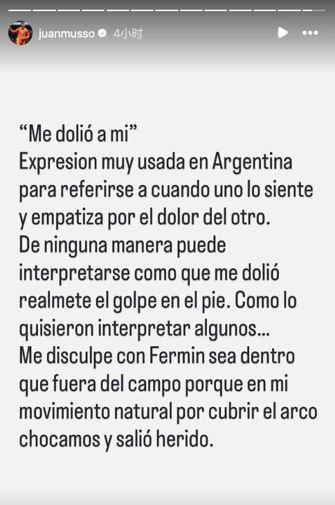 在一则标题为《这也让我难受》的社媒动态中,穆索解释表示:“这是阿根廷很常见的一种说法,用来表达你感受到、也能体会到别人的痛苦。这句话绝对不能被理解成那一下真的把我的脚踢疼了,但有些人就是想这么解读……无论在场上还是场下,我都向费尔明道了歉。当时我只是自然地去封堵球门,结果两个人撞在一起,他也因此受了伤。”