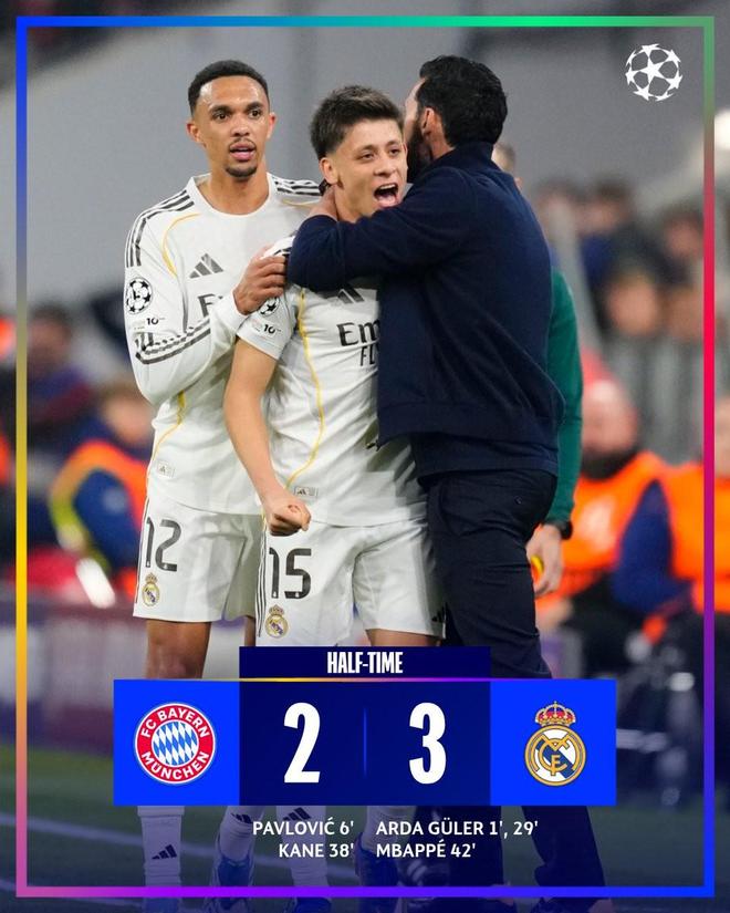 根据Stats Foot的统计,本场比赛前45分钟居莱尔的梅开二度和姆巴佩的进球是拜仁队史在欧冠的主场比赛中第二次遭遇上半场丢3球的情况。第一次则发生在2014年4月29日欧冠半决赛次回合的比赛中,当时拜仁的对手也是皇马,最终他们在主场0-4落败,总比分0-5出局。