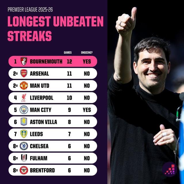 4月16日,据数据平台Opta统计,伯恩茅斯队的连续12场不败是本赛季英超目前的最长不败纪录。在联赛仅剩6轮的情况下,只有曼城队正在进行中的9场不败纪录还有望追上他们。第37轮,曼城队将在客场迎战伯恩茅斯。