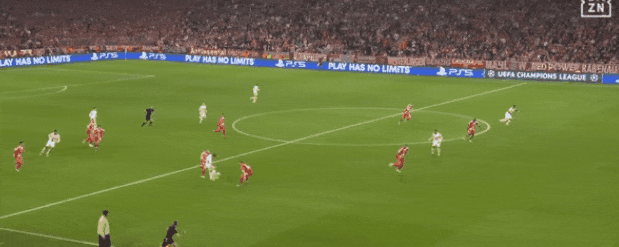 上一战极明白:凯恩压迫吕迪格,格纳布里们协同压迫,迪亚斯对付阿诺德,足以切断皇马后场所有短传路线,迫使皇马频繁大脚丢失球权。拜仁推进到进攻三区时,皇马只能收缩阵型,临时构筑五人防守线。皇马只能防反:抓拜仁整体防线高位前压的漏洞,夺回球权后立刻极速攻防转换,直插拜仁身后。