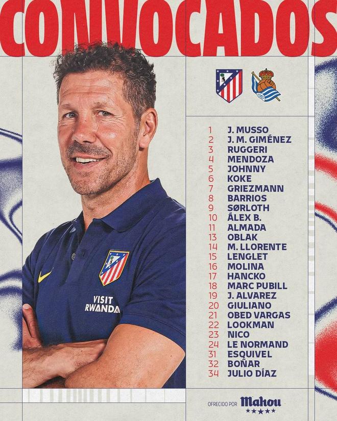 马德里竞技官方公布了国王杯决赛对阵皇家社会的比赛大名单,格列兹曼领衔,希门尼斯、汉茨科、巴里奥斯等人回归,比赛将于北京时间4月19日3:00进行。