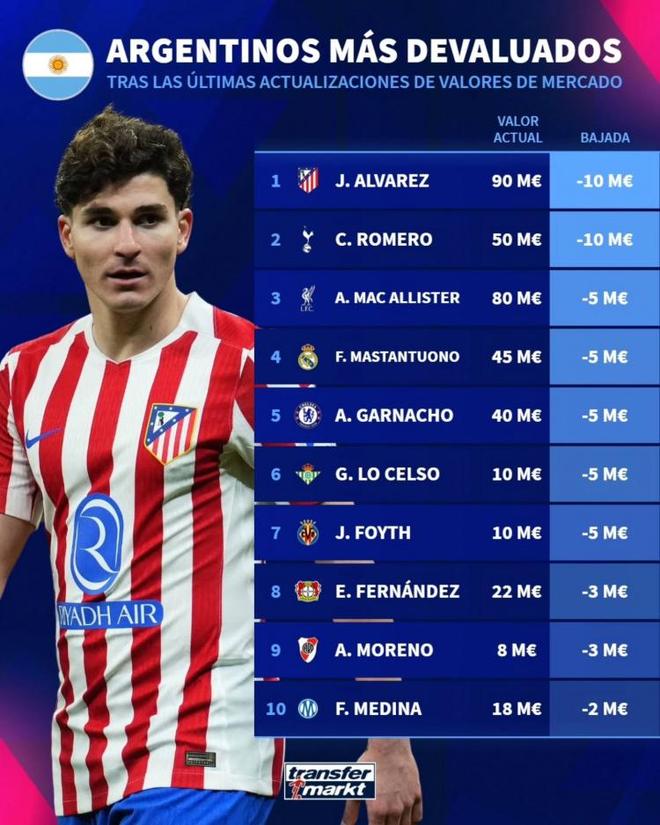 可是好马配好鞍,阿根廷想要努力实现这个成就,靠的还是队员们的发挥了。本赛季阿根廷队员在各自俱乐部发挥一般,他们需要好好找找状态,来给斯卡洛尼带来帮助。对比之下,本赛季个人身价下滑的阿根廷运动员,的确不少。