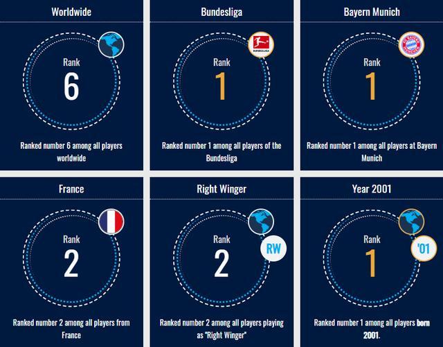 当前,奥利塞的1.4亿欧元身价,高居世界足坛第6、德甲第1、拜仁队内第1、法国队第2、右边锋第2、2001年球员第1!