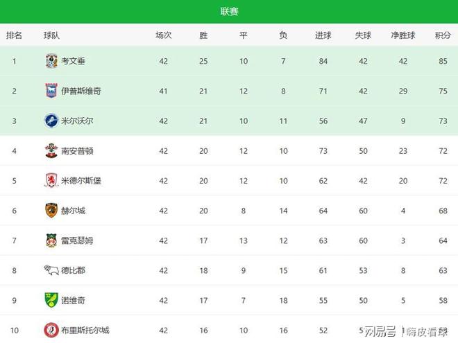 从英冠积分榜可以看出,考文垂有85分,遥遥领先,上赛季降级的伊普斯维奇少赛一场,拿到75分,紧随其后的米尔沃尔73分,南安普顿和米德尔斯堡同积72分,加上68分的赫尔城,64分的雷克瑟姆,还有63分的德比郡,这几支球队,都有机会冲上英超。
