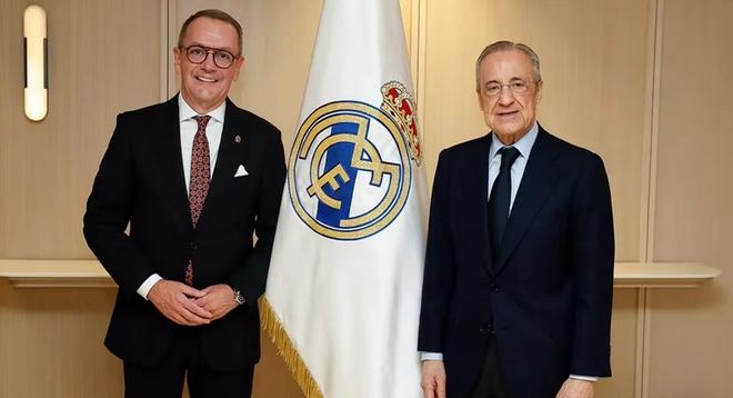 皇马主席弗洛伦蒂诺在贵宾看台接见了由该兄弟会主席拉蒙-马特奥斯带队、专程从洛尔卡赶来的代表团。