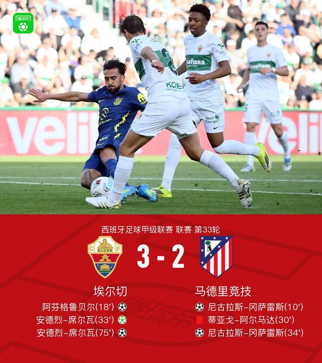 北京时间4月23日1:00,西甲第33轮,马德里竞技客场挑战埃尔切。上半场,尼古拉斯-冈萨雷斯铲射破门,阿芬格鲁贝尔将比分扳平,随后阿尔马达送点染红,安德烈-席尔瓦点射建功,仅过了1分钟,冈萨雷斯头球破门。下半场,巴埃纳越位进球被吹,安德烈-席尔瓦推射破门,格列兹曼兜射被扑,最终,马竞客场2-3埃尔切,埃尔切逃离降级区。