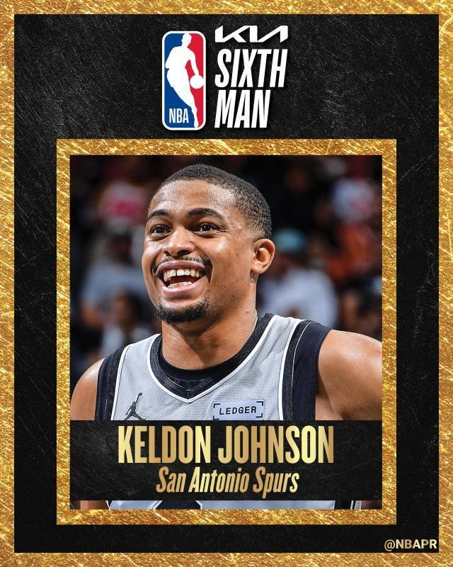 NBA官方宣布,马刺侧翼凯尔登·约翰逊当选年度最佳第六人。这个赛季,马刺队魂凯尔登·约翰逊保持全勤,场上场下均表现突出,帮助马刺取得62胜20负的战绩排名西部第二,还打进了NBA杯决赛。凯尔登·约翰逊本赛季常规赛总得分为1081分,打破吉诺比利保持的马刺队史替补球员单赛季得分纪录,成为队史第二位赢得年度最佳第六人奖项的球员(队史首位是吉诺比利)。本赛季常规赛,凯尔登·约翰逊打满83场全部替补上阵(常规赛82场+NBA杯决赛1场),场均登场23.3分钟可以贡献13.2分5.4篮板1.4助攻,投篮命中率是51.9%,三分命中率为36.3%,罚球命中率79.4%。
